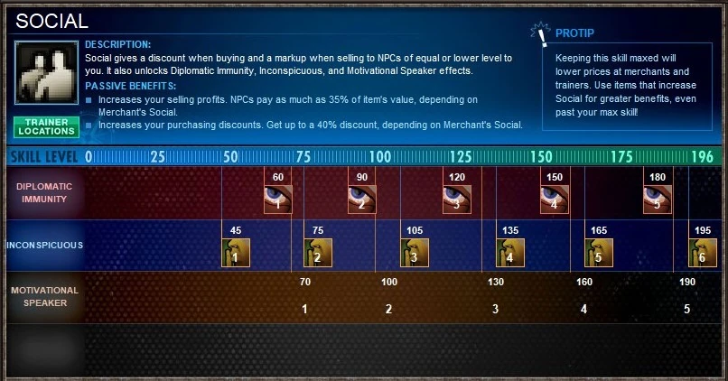 Your Social skill is your ability to work mercantile deals in your favor and manipulate others. Max value equals 75% Charisma plus 25% Perception.
